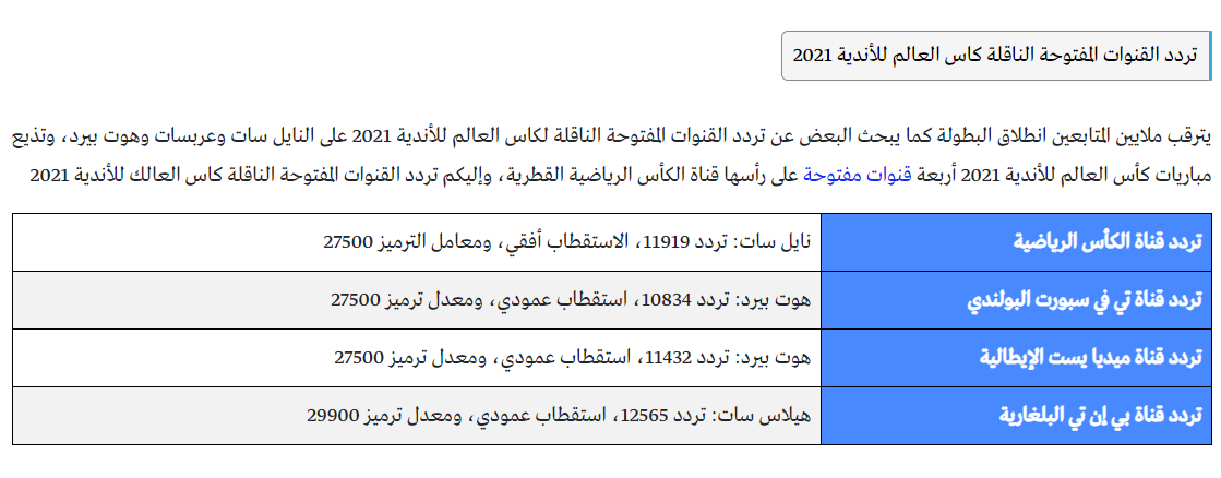 ننقل اليكم اليوم الاقمار الناقله لكأس العالم بالمجان قمر 📡 استرا 19 شرق astra 19e. تردد القنوات الاسرائيلية الناقلة لكاس العالم 2022 مجانا. تلفزيون الانترنت قنوات ومحطات تلفزيون بث مباشر. حرصا من موقع محتوى على توفير احتياجات قرائه المختلفة من القنوات التليفزيونية المختلفة وغيره من المواضيع التي تستحوذ على رضاكم وتنال إعجابكم ونظرا لتزايد البحث مؤخرا عن القنوات الإسلامية وخاصة تلك التي تتمتع بالمزايا السابق الإشارة إليها سوف. القنوات الناقله لكأس العالم علي هذا القمر.